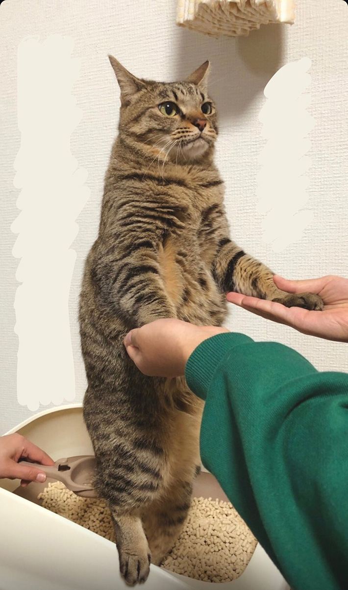 恥ずかしがるどころか、「ほれ、支えてニャ」といわんばかりに前脚を預けられるのは、投稿者さんに対する信頼の証といえそうですね。