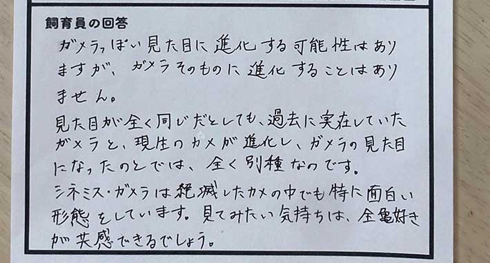 カメが『ガメラ化』することはある? 飼育員の回答が「さすがすぎる!」 By - grape編集部 公開:2025-06-03 更新:2025-06-03 カメ子供小学生貼り紙 Share Tweet LINE 三重県南牟婁郡にある道の駅『紀宝町ウミガメ公園』は、全国で唯一ウミガメの保護施設が併設されており、一般の人向けに無料公開しています。 同施設には、飼育員への質問を募る『質問用紙』が設置されており、Xアカウント(@umigame_kouen)では、来館者から寄せられた質問とその回答が人気です。 2025年6月2日、来館者から届いたのは、こんな質問でした。 『ガメラ』とは、特撮映画の『大怪獣ガメラ』シリーズに登場する怪獣のキャラクターで、巨大なカメのような見た目をしています。 長い地球の歴史の中で、生物はさまざまな変化を遂げてきました。質問者は「カメもいつか、ガメラのような大怪獣に進化するかもしれない…」と思ったのかもしれません。 そんな無邪気な質問に対して、飼育員の回答がこちらです。 飼育員いわく、「ガメラっぽい見た目に進化することはあっても、ガメラそのものに進化することはない」とのこと。 もし、現在のカメがガメラとそっくりな見た目になっても、それはガメラとはまったくの別種になるといいます。 また飼育員は、白亜紀前期に絶滅した、恐竜時代のカメ『シネミス・ガメラ』を紹介。実はこのシネミス・ガメラという名前は、怪獣映画のキャラクターである、ガメラが由来になっているそうですよ! 質問に丁寧に答えるだけでなく、怪獣のガメラにちなんだ補足情報も盛り込んだ回答には、さまざまな反応がありました。 ・絶滅動物の再現や復活にも触れる、とてもいい回答だと思った。 ・質問が面白い。回答もさすが!100点満点です。 ・ガメラに進化したら、この施設で世話しきれないだろうし、カメのままでいてほしいね。 身近な生き物を見て、「怪獣にそっくり」「恐竜はこんな見た目をしていたのかな」などと思った経験は誰にでもあるでしょう。 質問者はもちろん、回答を読んだたくさんの人がカメへの興味を深めるきっかけになったかもしれませんね。 出典grape/@umigame_kouen Share Tweet LINE