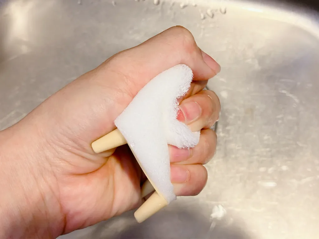 筆者が手に取ったのは、水アカを掃除するための、手のひらサイズのスポンジ。