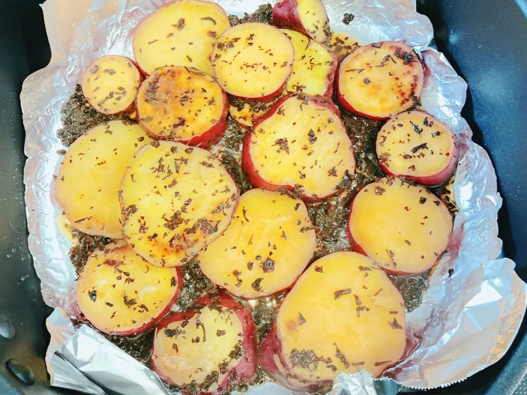 サツマイモをひっくり返し、全体に少し焼き目が付くようにしてください。