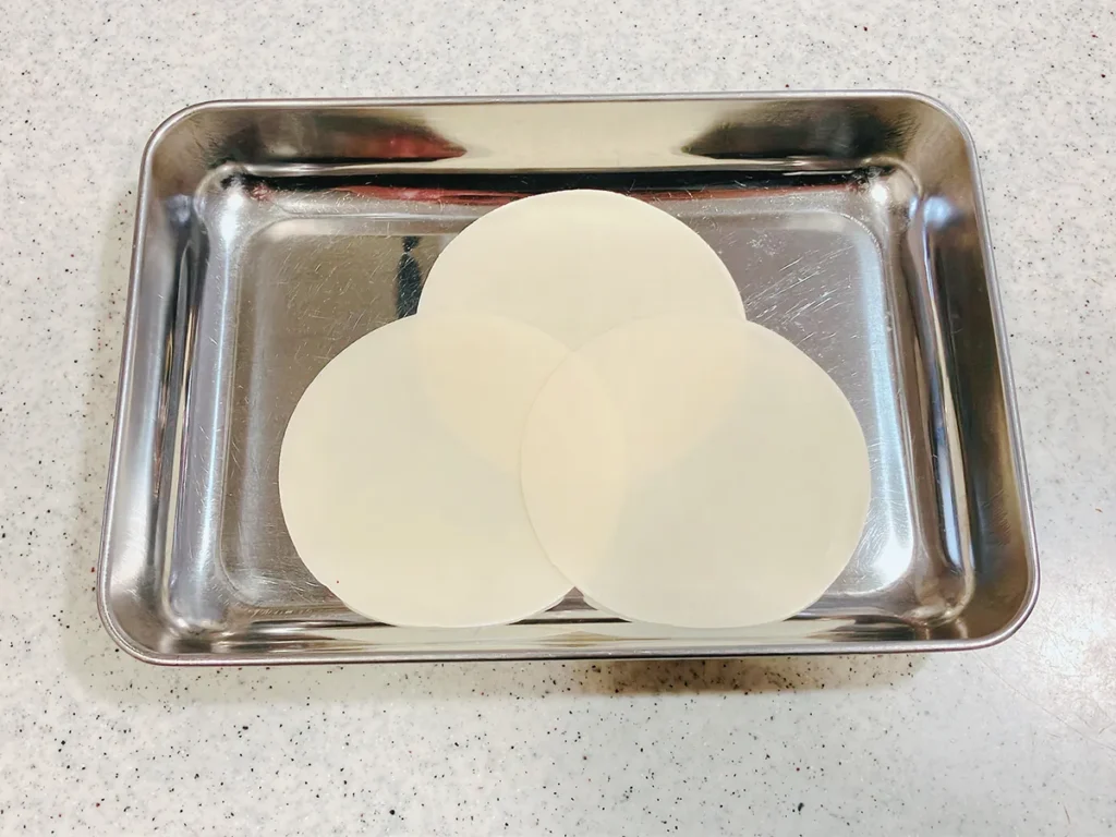 まずは、3枚の餃子の皮を重なり合うように置きます。