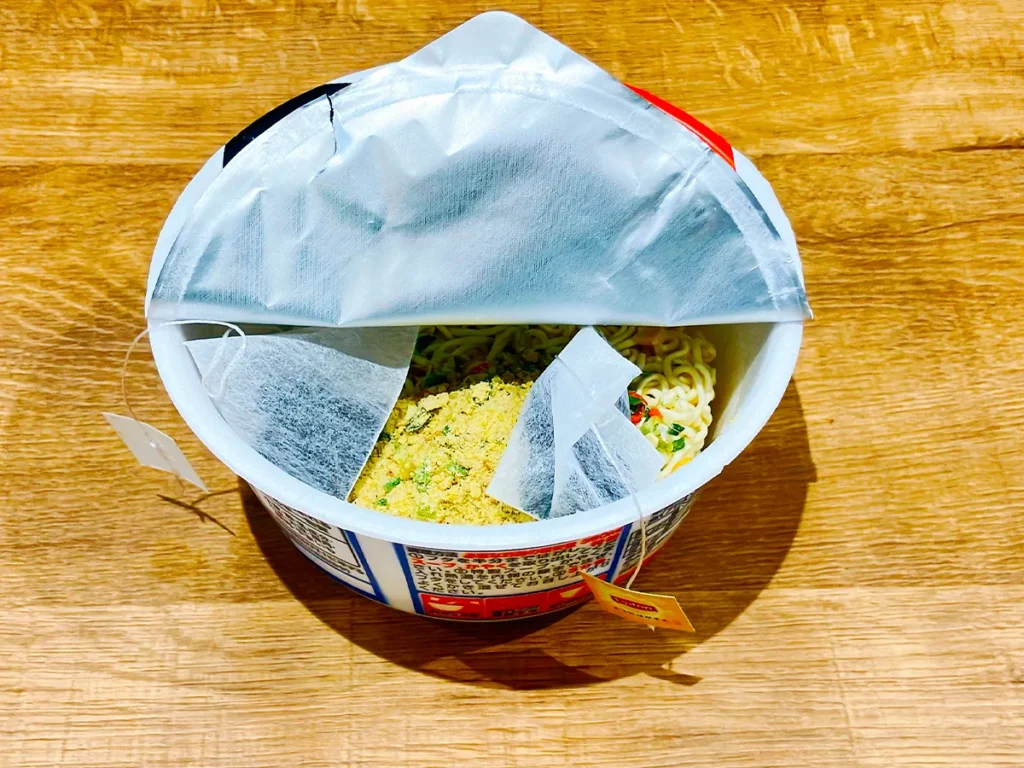 『サッポロ一番 塩らーめんどんぶり』の蓋を開け、付属の粉末スープとかやく、ティーバッグを2つ入れてください。
