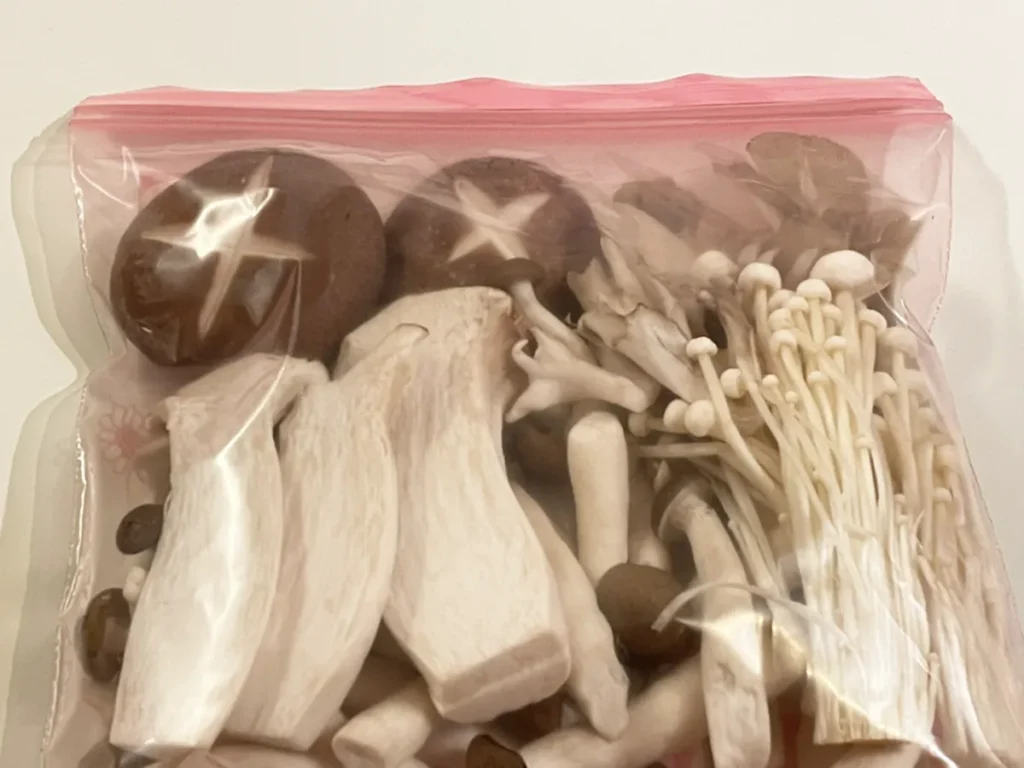 まずは、いろんな種類のキノコを用意します。それぞれ切ったり割いたりして、食べやすくしたら、フリーザーバッグに入れましょう。