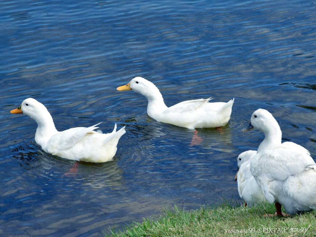 水辺でエサを探したり、もぐって遊んだりしているアヒルたちの賑やかな鳴き声が聞こえてきそうです!