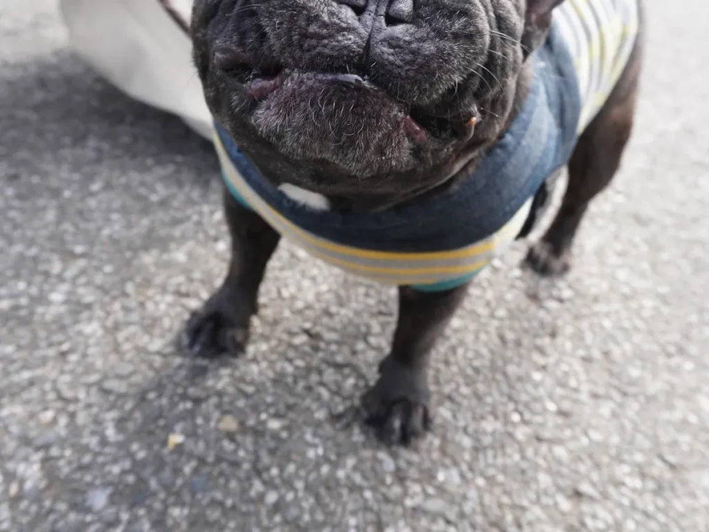 フレンチブルドッグ特有の、口周りの柔らかいヒダと、とびきりのスマイルが重なって、漫画のような表情になっています。